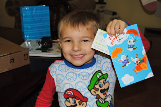 After breakfast and an early morning Skype with Grandpa & Nini Tanner opened his birthday gifts. He was thrilled to receive a Star Wars Lego set & Star Wars Lego coffee-table book from Nini & Grandpa, a new DS case, game box and two shirts from Mommy & Daddy, Toy Story 3 DVD from Grammy along with Kindergarten workbooks, an Anikin (Star Wars) costume from Aunt Tobey and a card & check from Nana-Gigi which he plans on using to buy a new game for the Wii. Earlier he received a really cool V-reader and "books" from Grandma & Papa. He loves all the generous gifts, thank you so much to our wonderful family!